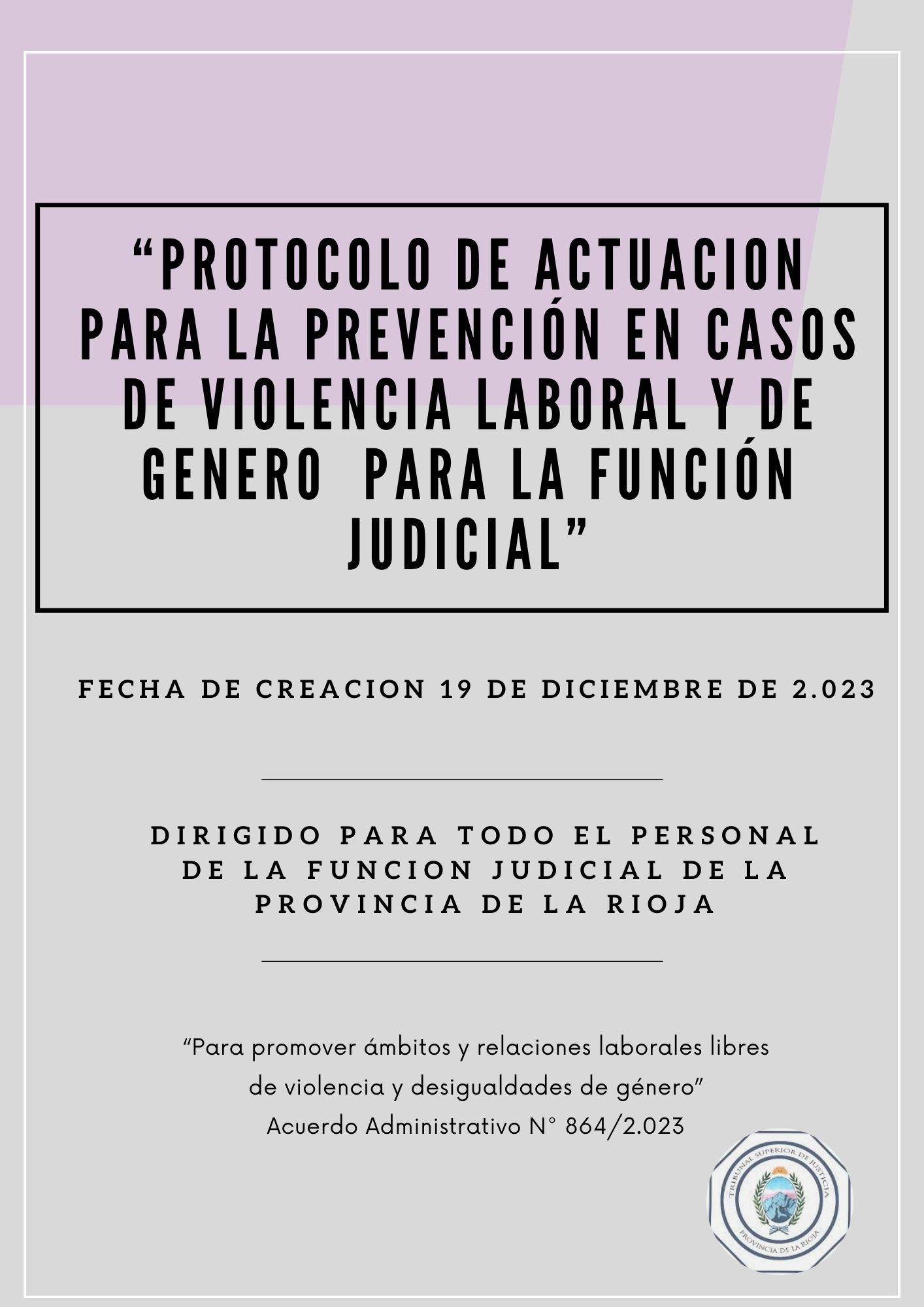 El Tribunal Superior de Justicia resolvió mediante Acuerdo N° 864/23 aprobar como Protocolo de Actuación para la Prevención de casos de Violencia Laboral y Violencia de Genero en la Función Judicial; entendiendo que la violencia laboral, en sus diversas manifestaciones, atenta contra la dignidad humana y constituye una amenaza para la salud de los y las trabajadores judiciales.