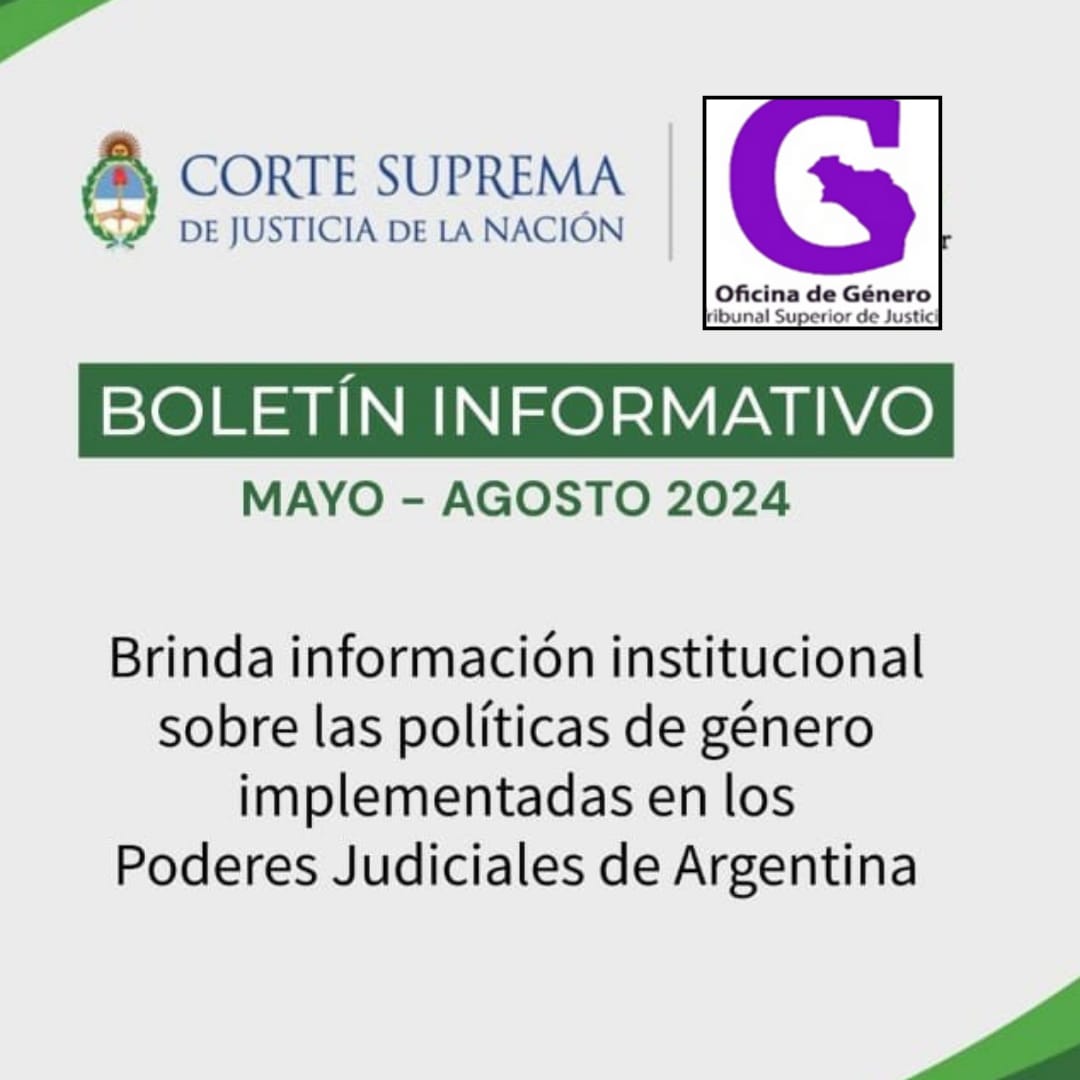 Compartimos el Boletín Informativo elaborado por la Oficina de la Mujer de la Corte Suprema de Justicia de la Nación junto a las Oficinas de la Mujer y Género de todo el país, correspondiente al segundo cuatrimestre (mayo-agosto 2024).
