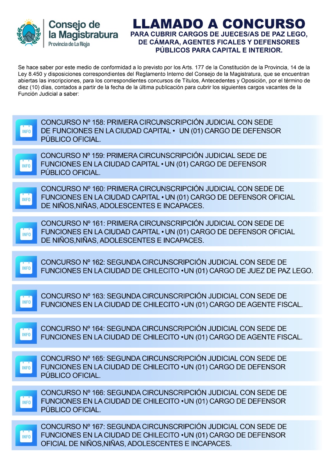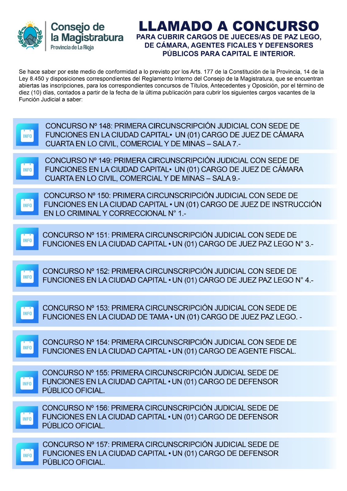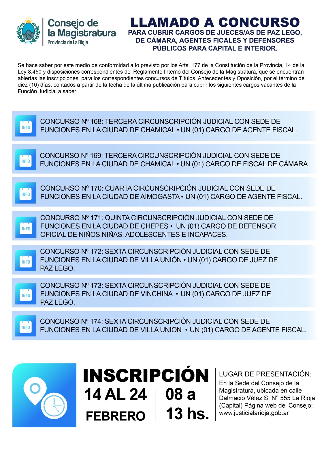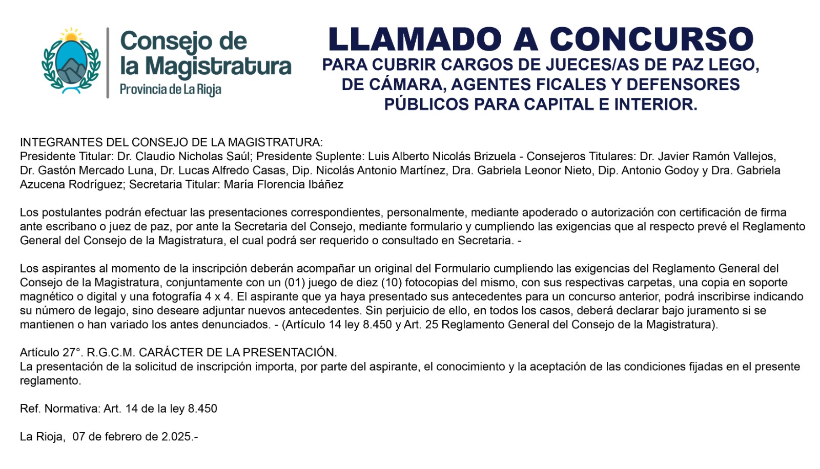 La convocatoria estará publicada en el sitio web oficial del Consejo de la Magistratura (www.justicialarioja.gob.ar) y en medios oficiales, donde se podrá consultar el reglamento y la normativa vigente.