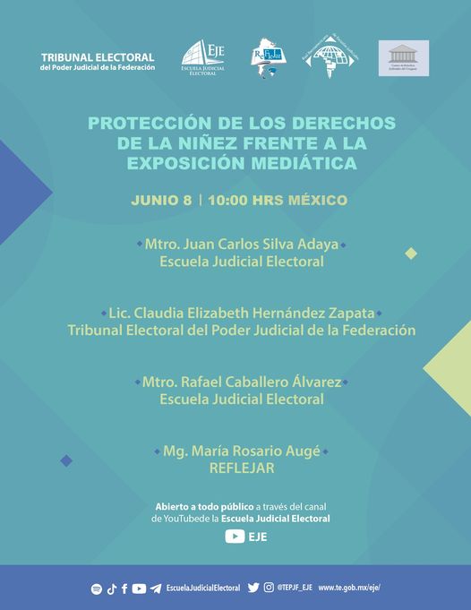 La Escuela Judicial Electoral de México, junto al Instituto REFLEJAR de Argentina y el CEJU del Uruguay, en el marco de la RIAEJ (Red Iberoamericana de Escuelas Judicales), secretaría a cargo de la Escuela Judicial de España, tienen el agrado de invitar a participar del encuentro sobre LA PROTECCIÓN DE LOS DERECHOS DE LA NIÑEZ FRENTE A LA EXPOSICIÓN MEDIÁTICA.