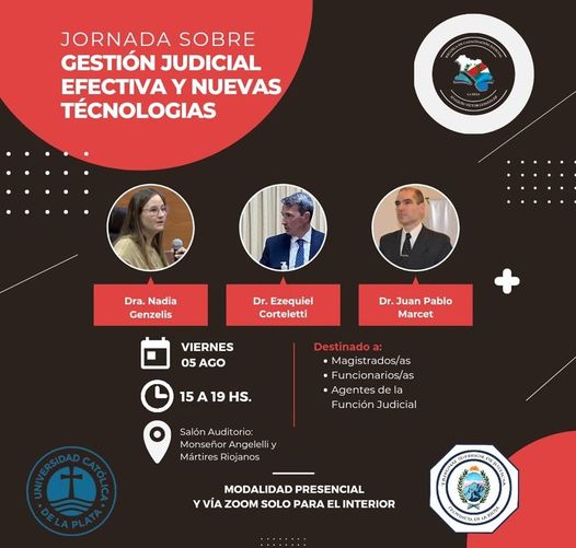 La Escuela de Capacitación Judicial "Joaquín V. González" del Tribunal Superior de Justicia, conjuntamente con la Facultad de Derecho y Cs Políticas UCALP, invitan a magistrados, funcionarios, empleados de la justicia y abogados, a participar de las segundas jornadas sobre Gestión Judicial efectiva y nuevas tecnologías, la misma se desarrollará el día viernes 5 de agosto en el horario de 15:00 a 19:00 en el Salón Auditorio "Monseñor Angelelli y Mártires Riojanos" que se encuentra en el edificio de Tribunales.