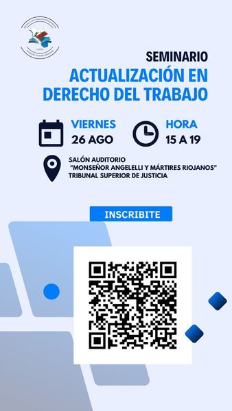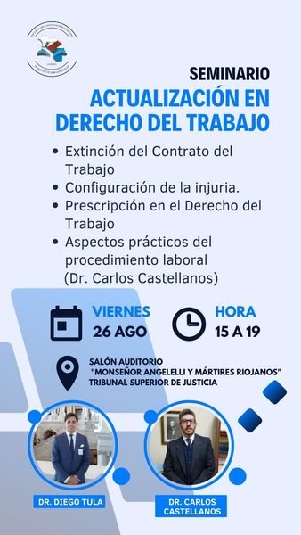 La Escuela de Capacitación Judicial "Joaquín V. González" del Tribunal Superior de Justicia, invita a Magistrados y Funcionarios del Fuero del Trabajo, abogados y aspirantes a cargos de Magistrados y Secretarios y empleados de los Juzgados del Trabajo y de Conciliación, a participar del Seminario de Actualización en Derecho del Trabajo, se desarrollará el día viernes 26 de agosto en el horario de 15:00 a 19:00 en el Salón Auditorio "Monseñor Angelelli y Mártires Riojanos".