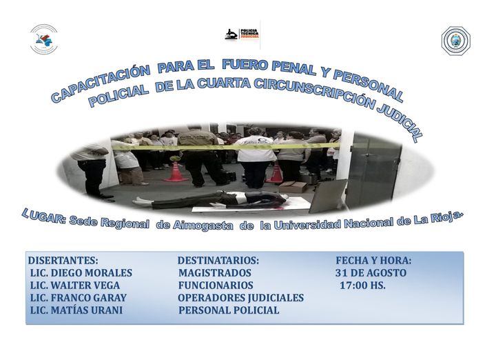 La Escuela de Capacitación Judicial "Joaquín V. González" del Tribunal Superior de Justicia conjuntamente con el Juzgado de Instrucción Penal y Correccional y la Policía Técnica Judicial Delegación de Aimogasta, invitan al personal del fuero penal de la Cuarta Circunscripción judicial y al personal policial de las distintas Comisarías que Componen la IV Circunscripción judicial (Aimogasta, Aminga, San Blas y Villa Mazan) a la capacitación que se dictara el día miércoles 31 de Agosto a las 17:00 hs en la Sede Regional de Aimogasta de la Universidad Nacional de La Rioja.
