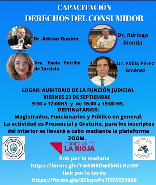 La Escuela de Capacitación Judicial "Joaquín V. González" del Tribunal Superior de Justicia de la provincia de La Rioja, invita a magistrados, funcionarios, abogados y público en general a participar de la capacitación sobre los "Derechos del Consumidor" el día viernes 23 de septiembre en el Auditorio de la Función Judicial.