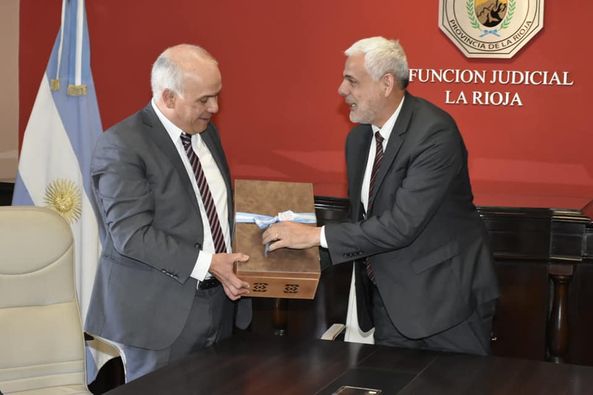 Por la mañana fue recibido por el Presidente del Tribunal Superior de Justicia, Dr. Claudio Saúl, en el encuentro que tuvo lugar en el salón de acuerdo del TSJ, el magistrado le dió la bienvenida a la provincia y le hizo entrega de un obsequio en nombre de la Escuela de Capacitación, luego mantuvieron un charla en el marco de la presentación de la jornada de disertación.