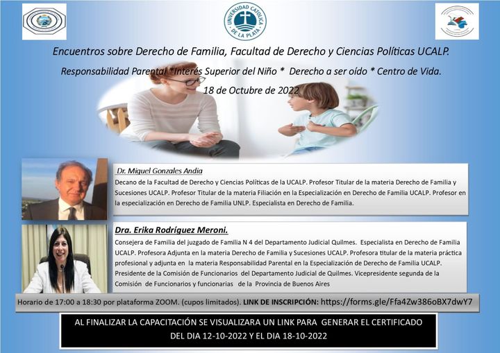 En esta oportunidad disertaran el Dr. Miguel Gonzales Andia, Decano de la Facultad de Derecho y Ciencias Políticas de la UCALP, Profesor Titular de la materia Derecho de Familia y Sucesiones UCALP, Profesor Titular de la materia Filiación en la Especialización en Derecho de Familia UCALP, Profesor en la especialización en Derecho de Familia UNLP, Especialista en Derecho de Familia y la Dra. Erika Rodríguez Meroni, Consejera de Familia del juzgado de Familia N 4 del Departamento Judicial Quilmes, especialista en Derecho de Familia UCALP, Profesora adjunta en la materia Derecho de Familia y Sucesiones UCALP , Profesora titular de la materia práctica profesional y adjunta en la materia Responsabilidad Parental en la Especialización de Derecho de Familia UCALP, Presidente de la Comisión de Funcionarios del Departamento Judicial de Quilmes, Vicepresidente segunda de la Comisión de Funcionarios y funcionarias de la Provincia de Buenos Aires.