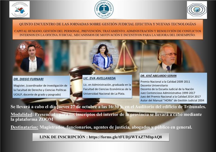 La Escuela de Capacitación Judicial "Joaquín V. González" del Tribunal Superior de Justicia, conjuntamente con la Facultad de Derecho y Cs Políticas UCALP, invitan a magistrados, funcionarios, empleados de la justicia y abogados, a participar de las quintas jornadas sobre Gestión Judicial efectiva y nuevas tecnologías, la misma se desarrollará el día jueves 27 de octubre en el horario de 16:30 a 19:00 en el Salón Auditorio del edificio de Tribunales.