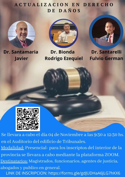 La Escuela de Capacitación Judicial "Joaquín V. González" del Tribunal Superior de Justicia de la provincia de La Rioja, conjuntamente con la Universidad de Palermo invitan a magistrados, funcionarios, abogados y público en general a participar del Seminario sobre Actualización en Derechos de Daños, el mismo se desarrollará el día viernes 4 de noviembre de 9,30 a 12,00 hs. en el auditorio del edificio de tribunales.