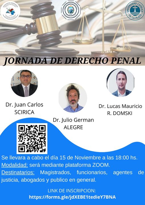 La Escuela de Capacitación Judicial "Joaquín V. González" del Tribunal Superior de Justicia, conjuntamente con la Facultad de Derecho y Cs Políticas UCALP, invitan a magistrados, funcionarios, empleados, abogados y público en general, a participar de la JORNADA SOBRE DERECHO PENAL, la misma se desarrollará el día martes 15 de noviembre a las 18:00 hs. por plataforma ZOOM, los temas que se abordarán son Competencia de la Víctima en el dominio del hecho, Autopuesta y Heteropuesta en peligro consentida, Criterios de imputación penal en ámbitos organizados, Debate oral en hechos de violencia de Género.