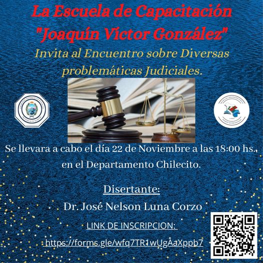 La Escuela de Capacitación Judicial "Joaquín V. González" del Tribunal Superior de Justicia, invita a magistrados, funcionarios y personal de la Segunda Circunscripción judicial al conversatorio sobre "Diversas problemáticas judiciales" el día martes 22 de noviembre a las 18:00 hs. en la Sala de Audiencias del Edificio de la Función Judicial de Chilecito.