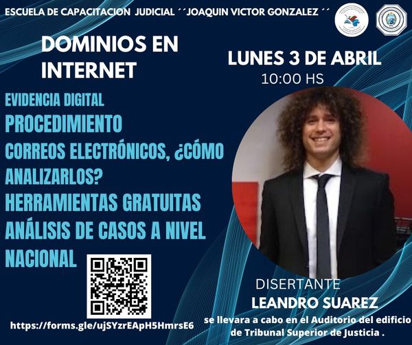 Leandro Suárez se presentará en el Auditorio del edificio del Tribunal Superior de Justicia el día lunes 3 de abril a las 10 hs., disertará sobre estafas informáticas, búsqueda de información en fuentes abiertas, preservación de evidencia digital en el fuero penal, análisis de correos electrónicos (identificación, contenido y análisis) y casos.