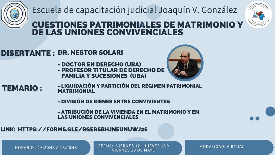 La Escuela Judicial "Joaquín V. González" de la Rioja invita a participar de la capacitación sobre Cuestiones patrimoniales de matrimonio y de las uniones convivenciales que se dictará por modalidad virtual – Plataforma Zoom los días: viernes 12, jueves 18 y viernes 19 de mayo en el en el horario de 16.30 a 18.00 hs.