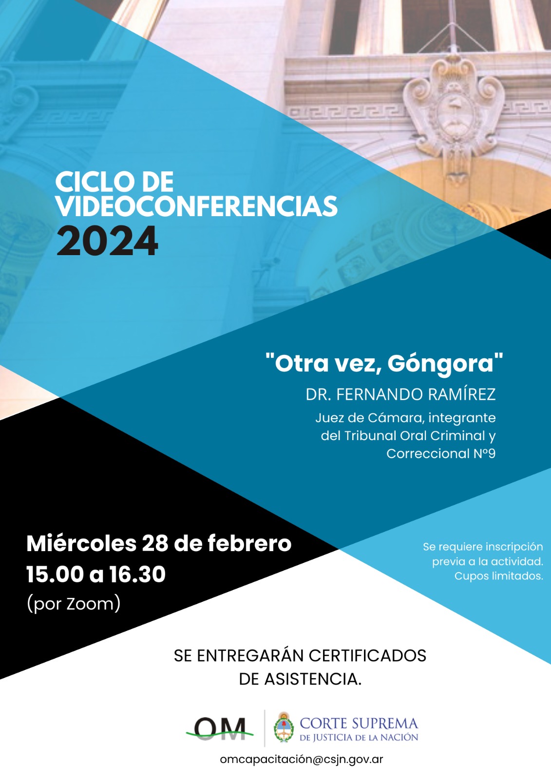 La Oficina de Género del Tribunal Superior de Justicia tiene el agrado de invitar al Ciclo de Videoconferencias sobre “Otra vez, Góngora. Expondrá el Dr. Fernando Ramírez, Integrante del Tribunal Oral en lo Criminal y Correccional N°9, evento organizado por la Oficina de la Mujer de la Corte Suprema de Justicia de la Nación.