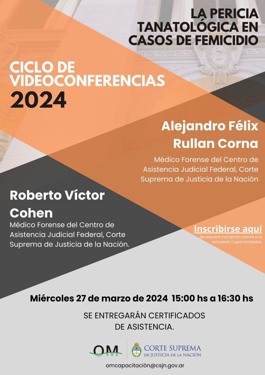 La Oficina de Género del Tribunal Superior de la Rioja invita a la videoconferencia sobre “LA PERICIA TANATOLÓGICA EN CASOS DE FEMICIDIO” a cargo de los Dres. Roberto Víctor Cohen y Alejandro Rullan Corna; dicha conferencia es organizada por la Oficina de la Mujer de la Corte Suprema de Justicia de la Nación y se llevara a cabo por la plataforma ZOOM el día miércoles 27 de marzo de 15.00 a 16.30 horas. Se entregarán certificados a los que previamente se hayan inscripto.
