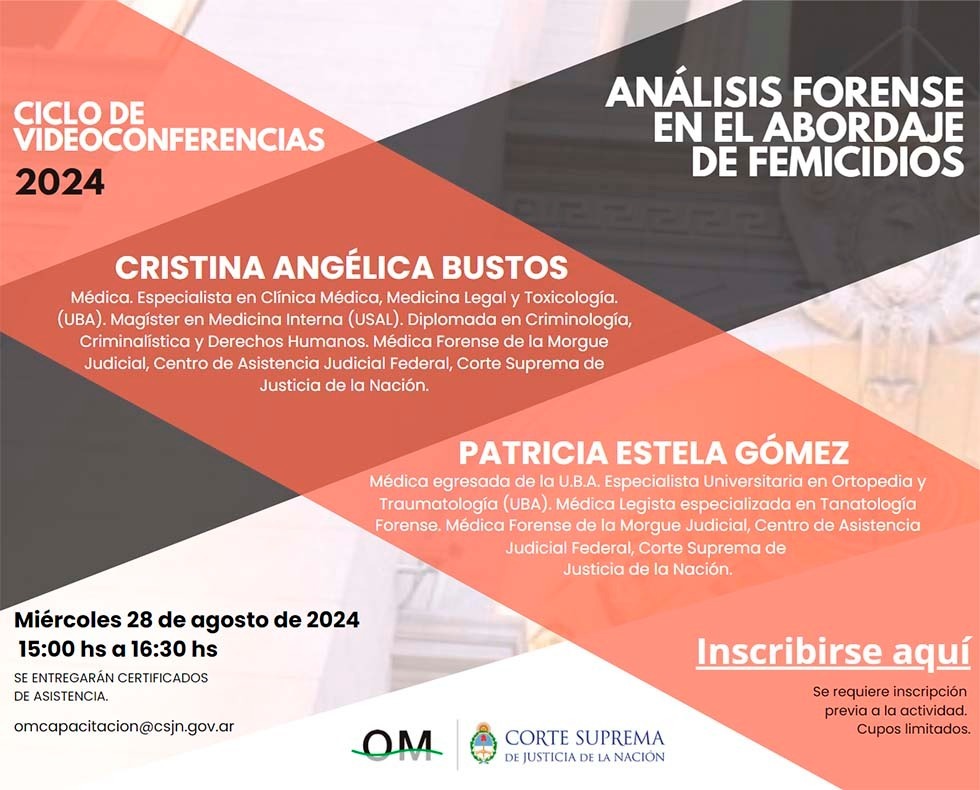 Desde la Oficina de Género del Tribunal Superior de Justicia de La Rioja, invitamos a participar del ciclo de videoconferencias el "Análisis Forense en el Abordaje de Femicidios", el miércoles 28 de agosto de 2024, a las 15hs.