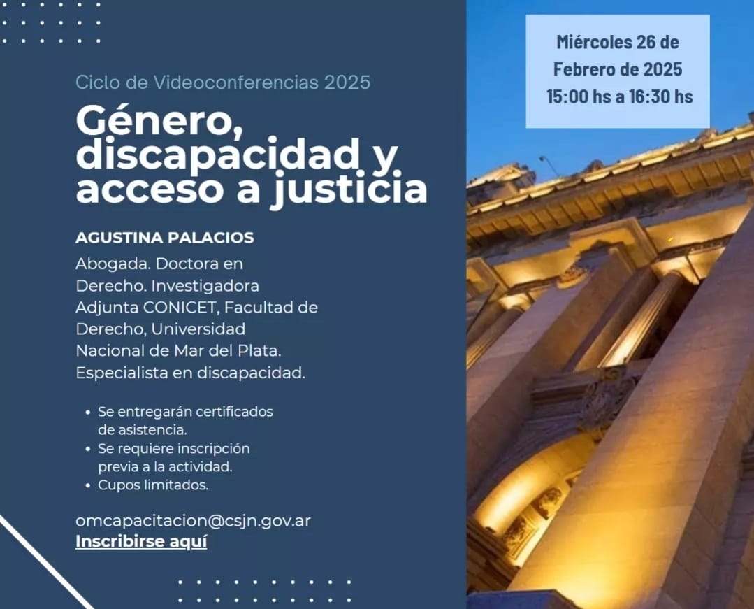 Desde la Oficina de la Mujer (OM) del Superior Tribunal de Justicia de Entre Ríos tenemos el agrado de invitarla/o a la videoconferencia, organizada por la OM de la Corte Suprema de Justicia de la Nación, sobre "Género, discapacidad y acceso a justicia" a cargo de la expositora Dra. Agustina Palacios.