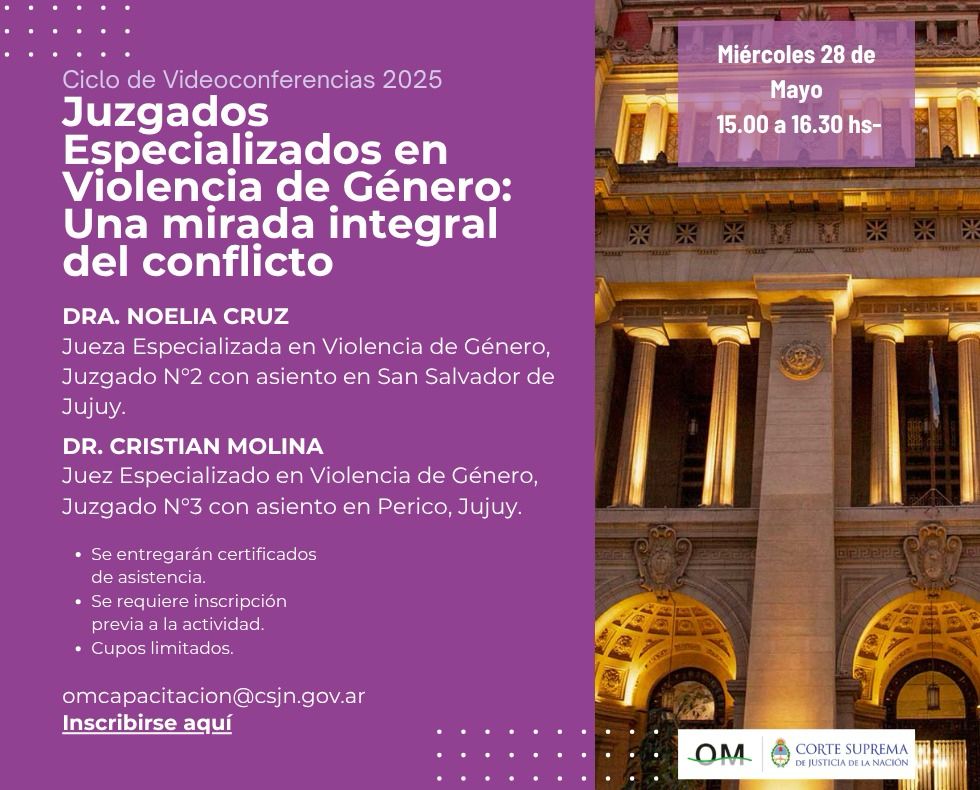 La Oficina de Género del Poder Judicial de la provincia de La Rioja tiene el agrado de hacer extensiva la invitación a la videoconferencia organizada por la Oficina de la Mujer (OM) de la Corte Suprema de Justicia de la Nación, titulada: "Juzgados Especializados en Violencia de Género: una mirada integral del conflicto".