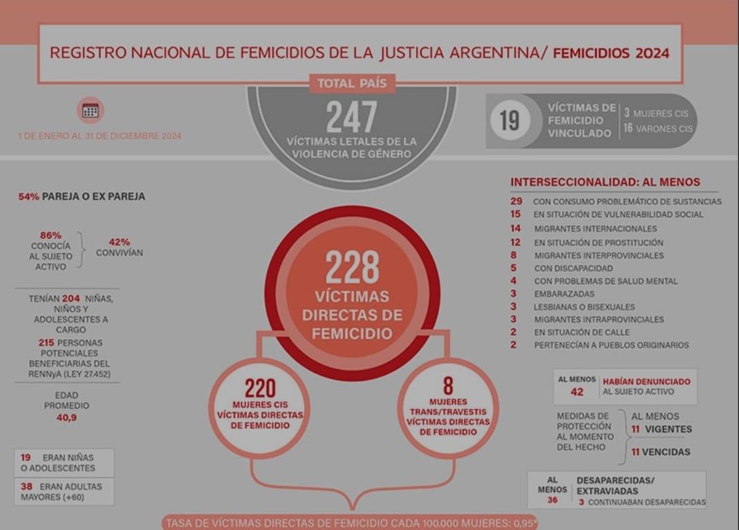 En 2024, en la Argentina se contabilizaron 228 víctimas directas de femicidio y 19 víctimas de femicidio vinculado, lo que implica 247 víctimas letales de violencia de género. Las 228 víctimas directas de femicidio incluyen 220 mujeres cis y 8 mujeres trans/travestis.
